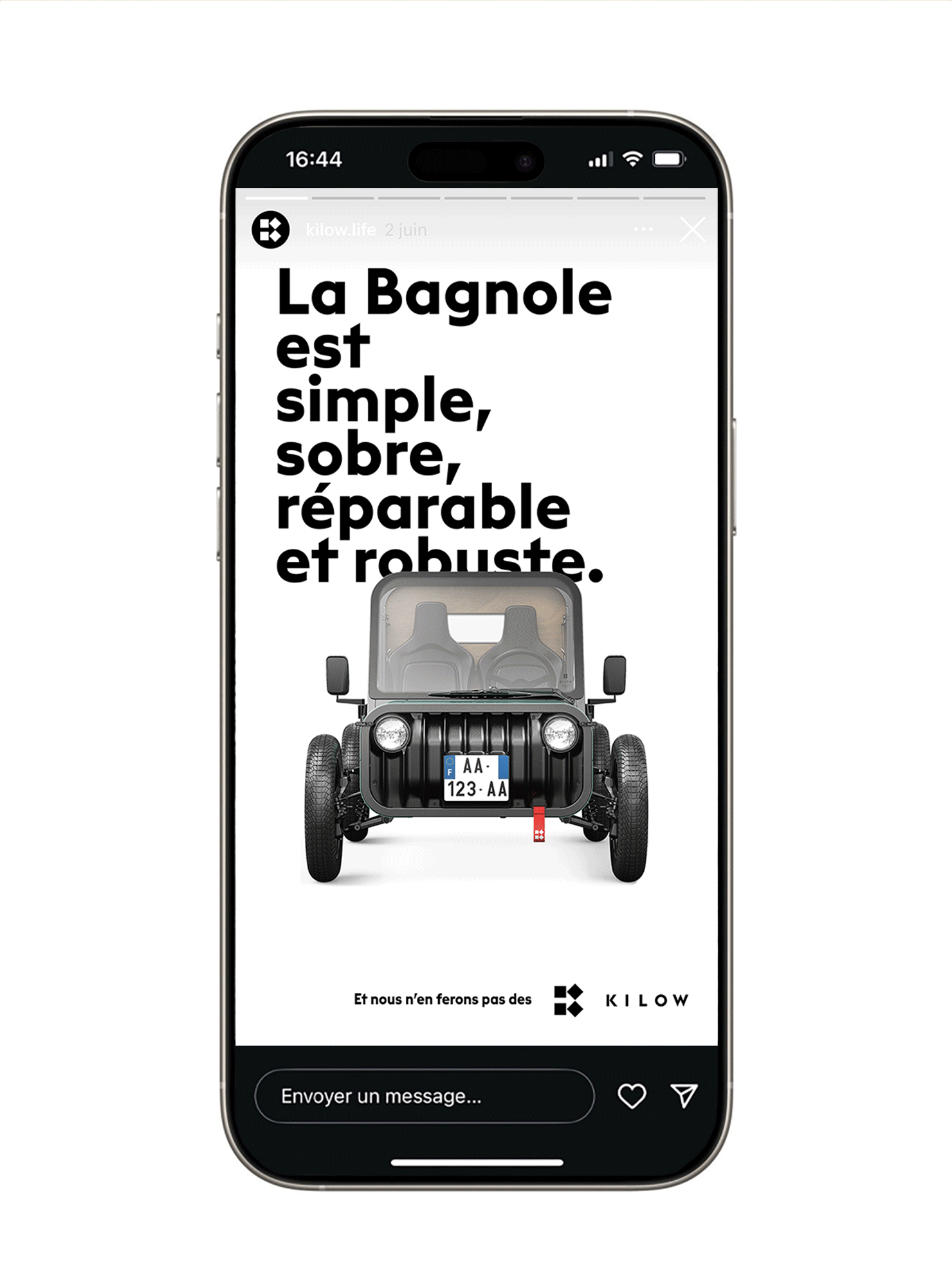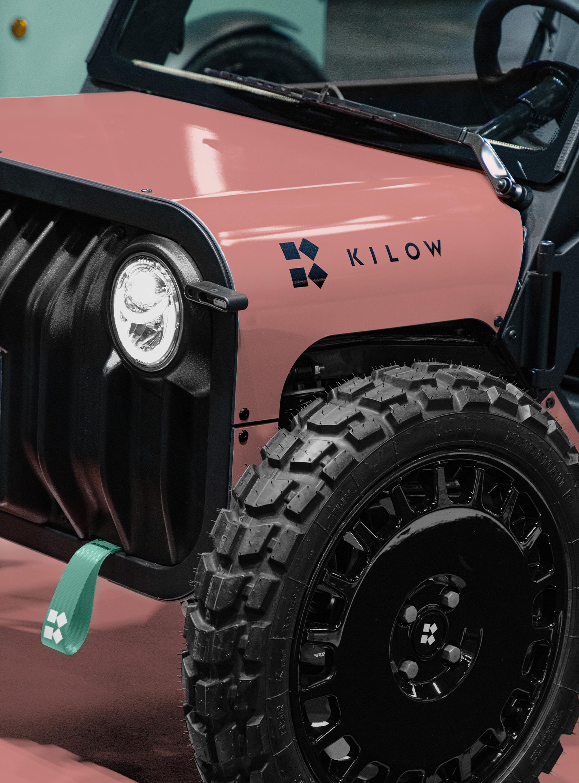 Based in the french Alps, Kilow is a new player in electric mobility vehicles, from cars to bikes. La Bagnole is the brand’s flagship automobile: light, minimal, and adorable. With an exterior and interior design by Leo Choisel, La Bagnole caught our eye, and we reached outto help the brand grow. We changed the namefrom kgEV to Kilow, in reference to its low impact on the environment - and its use of kilowatts of course.